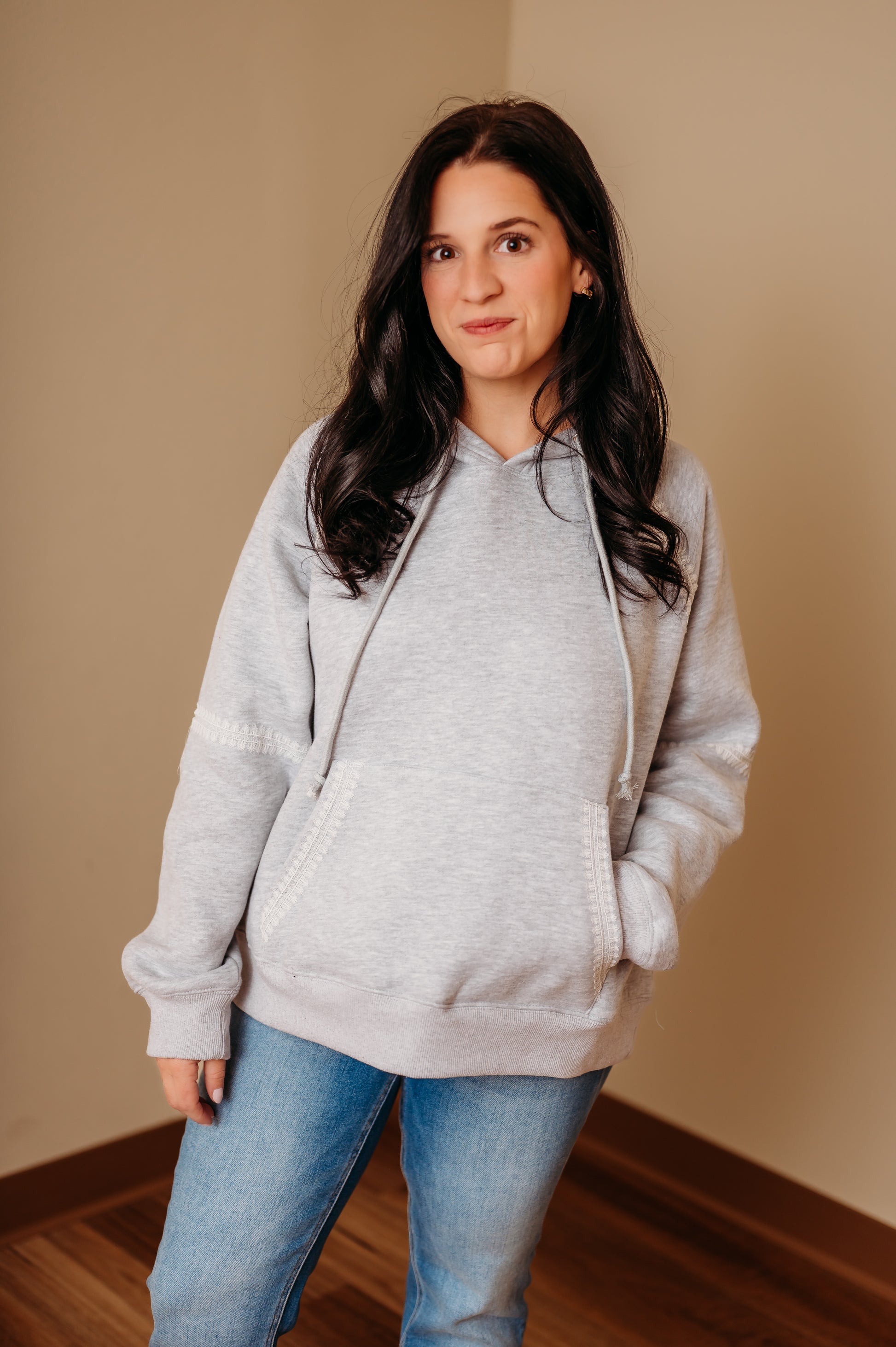 Stay cozy and stylish in this hoodie, crafted from our softest fabric for all-season comfort. Featuring an oversized relaxed fit and delicate lace trim for a feminine, sophisticated touch, this hoodie is perfect for lounging at home or running errands.