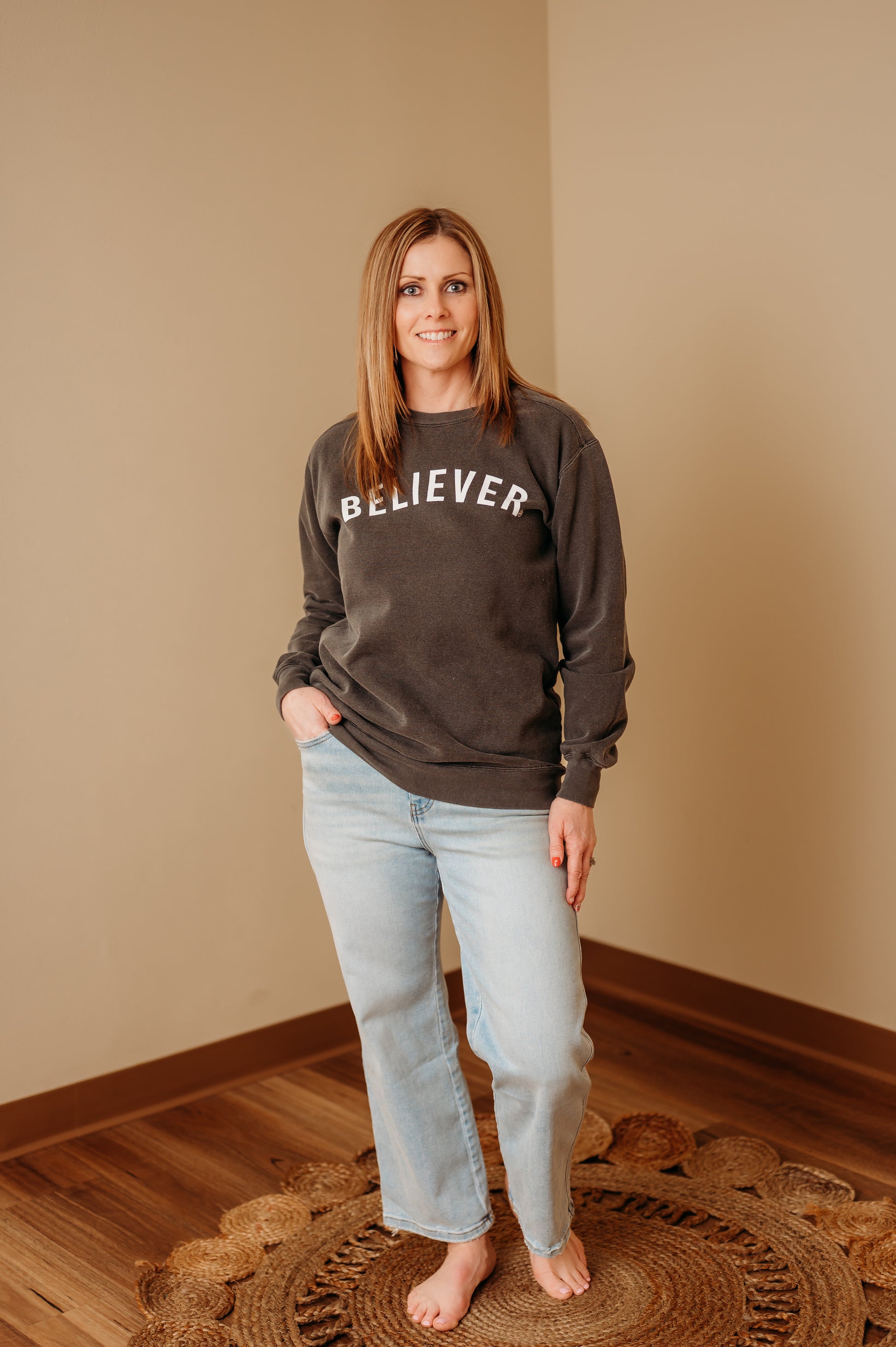 Stay cozy and stylish with this “Believer” Comfort Colors sweatshirt in a rich Pepper color. Made from soft-washed, garment-dyed fabric, it features a classic crew neck and long sleeves for a relaxed, unisex fit that feels comfortable from the moment you put it on. Perfect for layering or lounging, this sweatshirt pairs effortlessly with jeans or leggings for an easy, confident look.