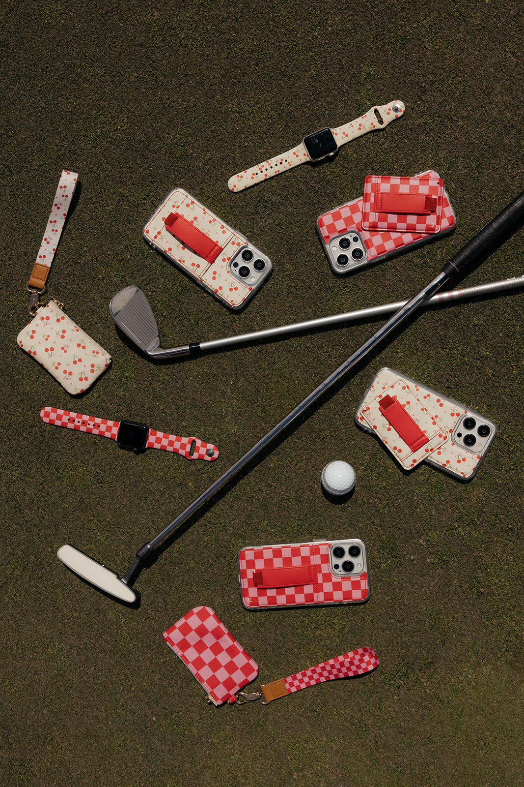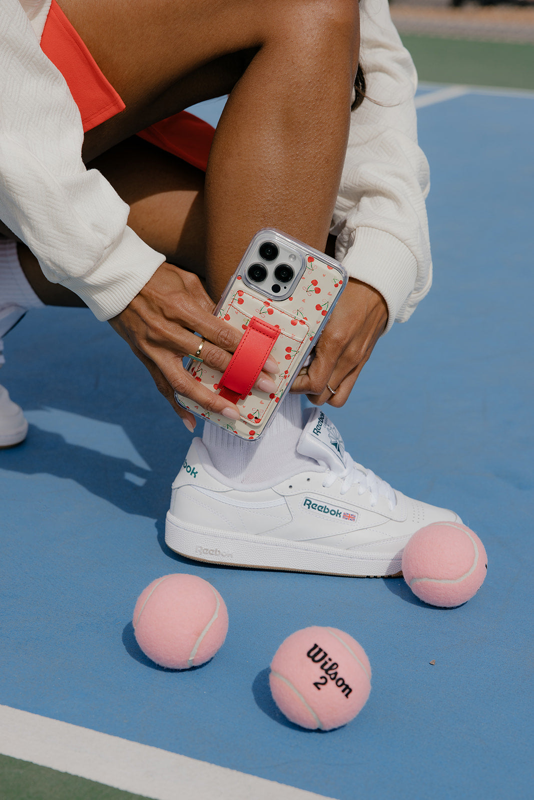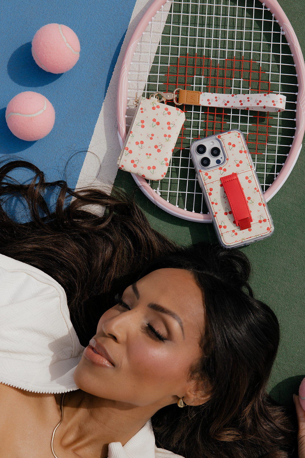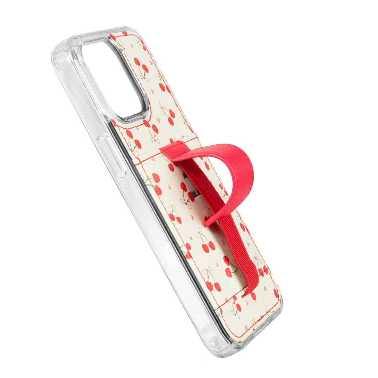Case Design: Watercolor red cherries with bright ribbons and pink hearts on a cream background.