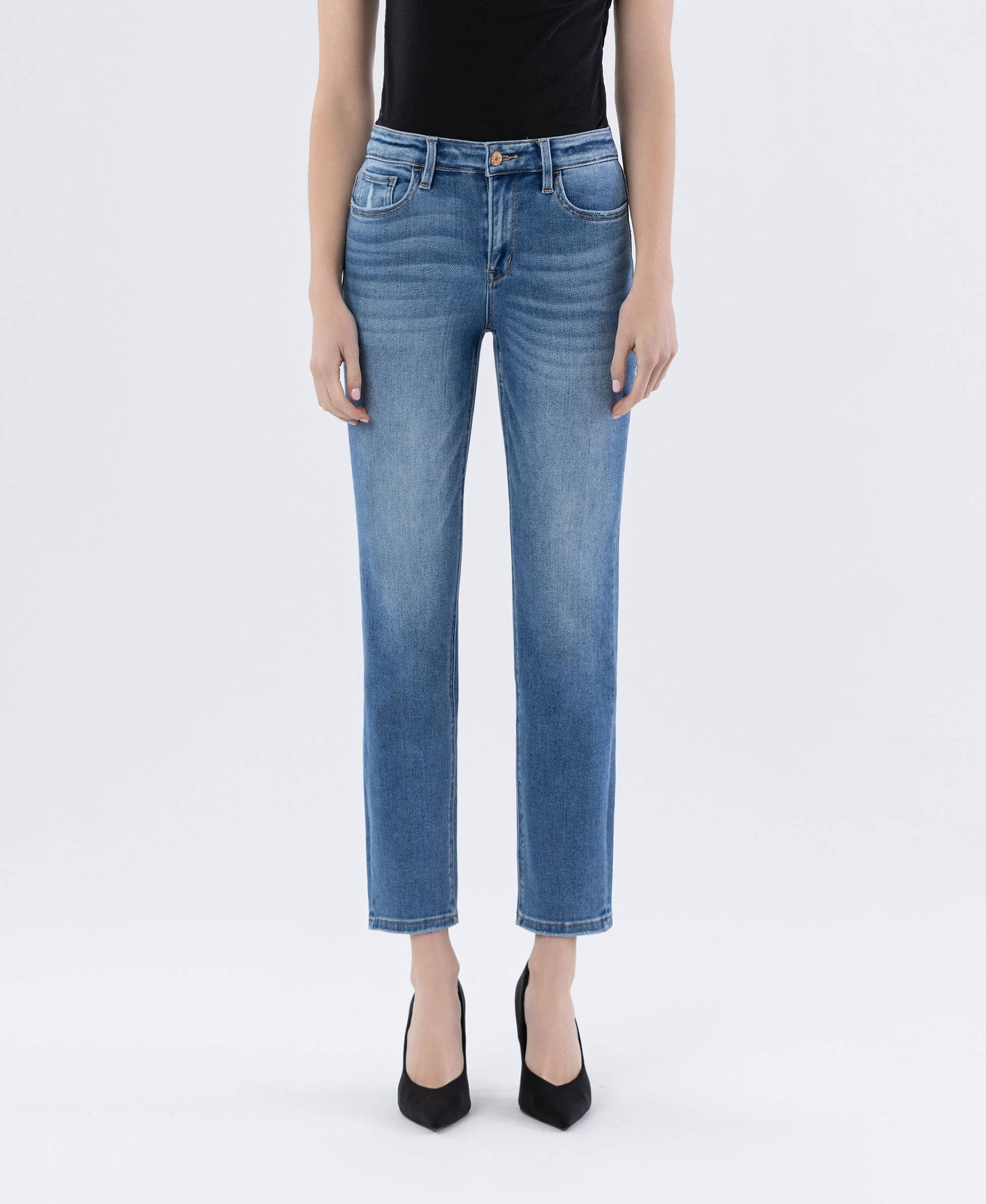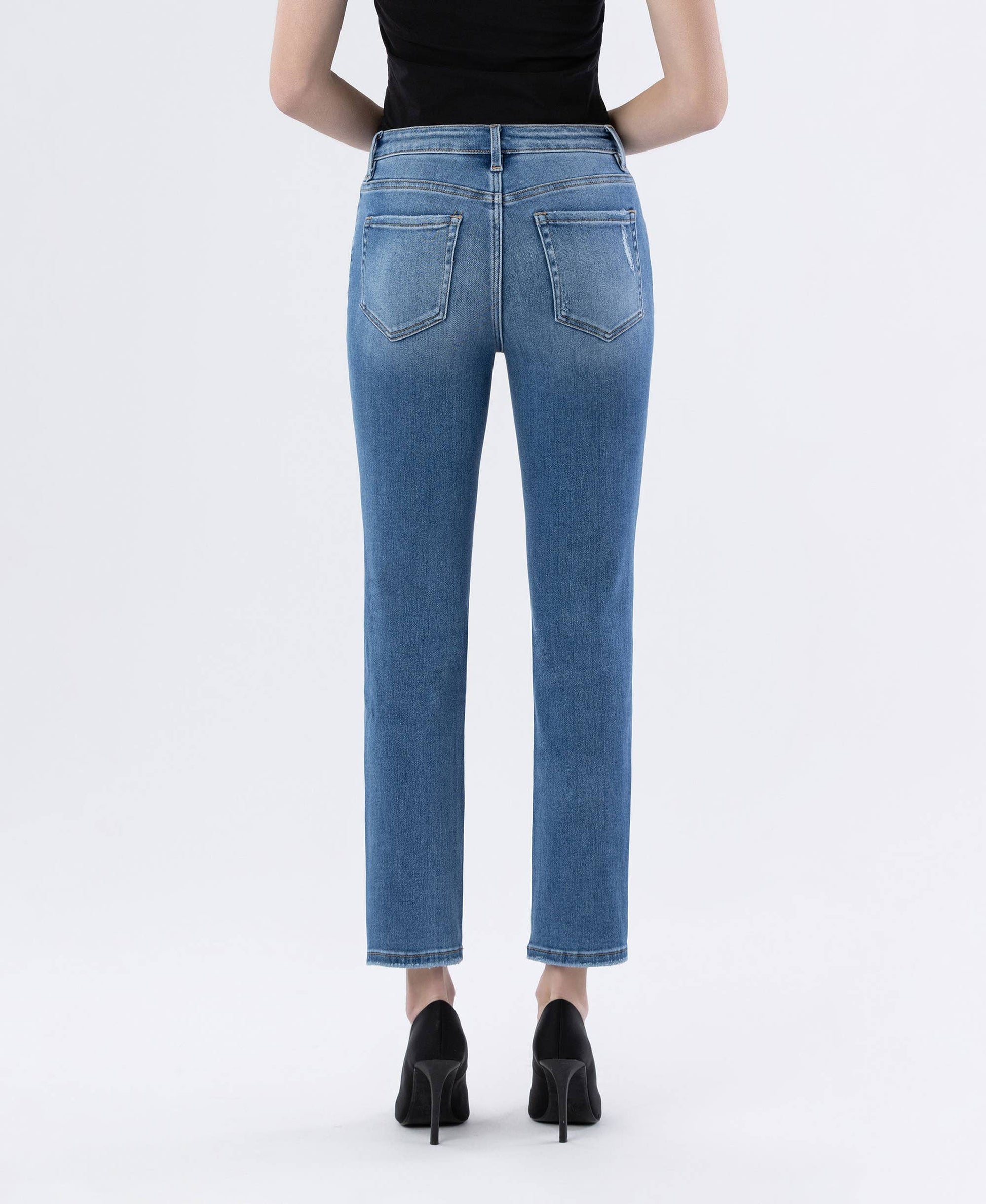 Step out in style with our Vervet by Flying Monkey High Rise Slim Straight Jeans. Made from comfortable stretch denim, these jeans feature a high-rise waist, slightly distressed detailing, finished hem, and a flattering ankle-length slim straight silhouette. Designed for everyday wear, they offer a modern, versatile fit perfect for pairing with sneakers, boots, or heels.