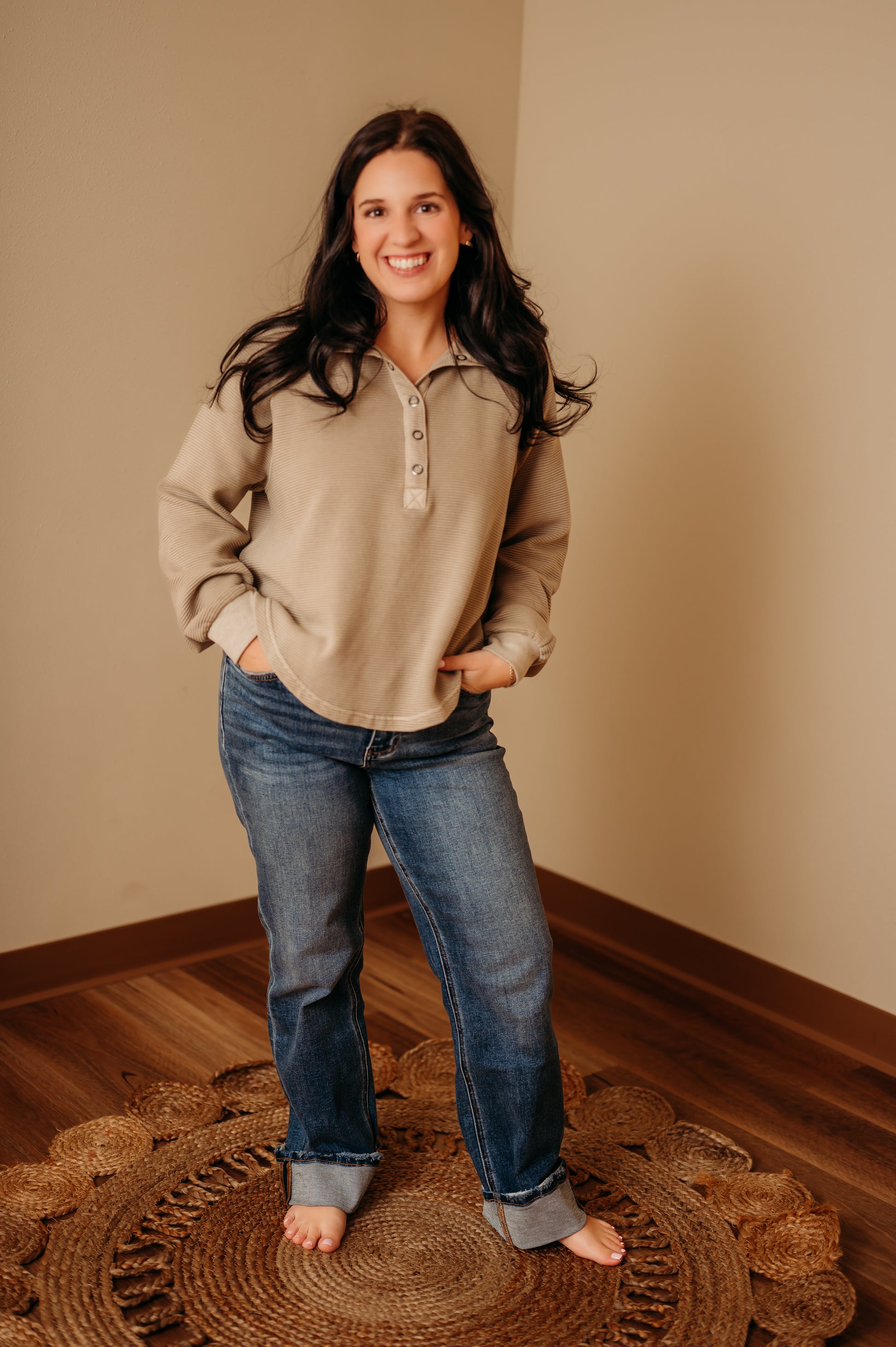 Ribbed Mock Neck Henley Knit Top - Mocha